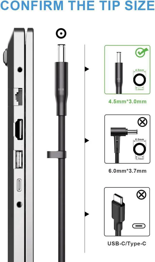 • Connector Size: Interior diameter: 4.5 mm ; External diameter: 3.5mm; (Note: Please make sure the DC output and tip size of ac adapter are accordant before you buy