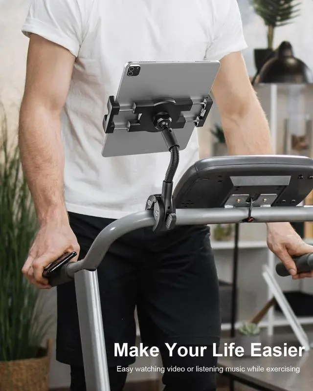 woleyi Gooseneck Tablet Bike Mount for Indoor Cycling, Gym Treadmill, Spin bike, Stationary Exercise bicycle, Peloton Handlebar, Elliptical, Stroller Clamp for iPad Pro/Air/Mini, Phone, 4.7 -13" Tablet