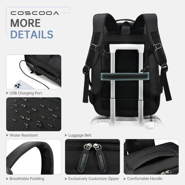 Large Capacity Backpack with 11 Pockets30L large travel laptop backpack from COSCOOA suitable for 3-5 days travel. Main pocket x1,laptop padded compartment x1 (fit up to 17 laptop),shoe compartment x1fit up to size 45 shoes),front zipper pocket x2, back zipper pocket x1,expandable side pocket x1,and other convenient inside pockets for travel essentials.