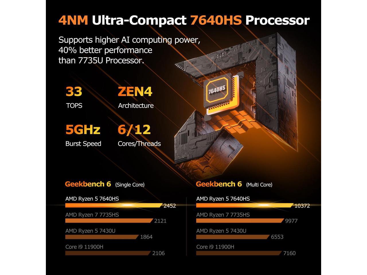 - Ultra-Compact 7640HS Processor With ZEN 4 architecture and TSMCs 4nm FinFET, the 7640HS mini PC reduces power consumption by over 62% in heavy gaming compared to 6nm processors, offering longer-lasting time. It boosts data throughput and AI performance by 60% over the 7735U and 80% over the 7430U. Featuring a 45W TDP, double L2/L3 cache, and 5GHz boost, it matches i5-13400F+RTX 3050 desktop PC, supporting 60FPS video processing, 22FPS AI rendering, and smooth 1080p 3A gaming.