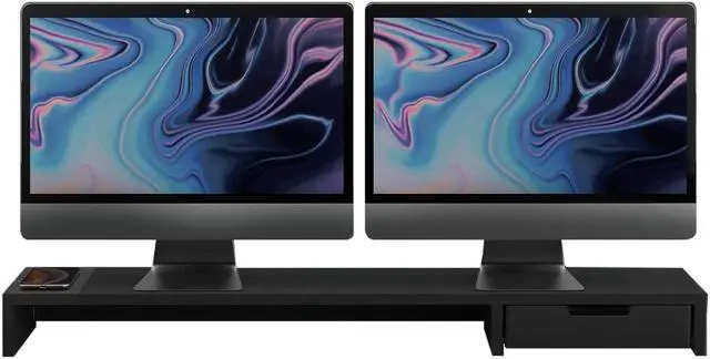 POUT E9 Dual Monitor Stand with Drawer - Wireless Charger and USB Hub (Deep Black)