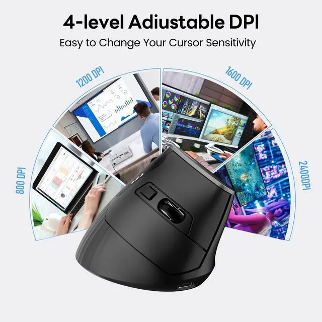 4-Level DPI Adjustment: 800-1200-1600-2400, allowing you to switch between different sensitivity settings. Whether you need precise control for tasks like graphic design or fast movements for gaming, this vertical mouse wireless offers the flexibility you need with just a click.