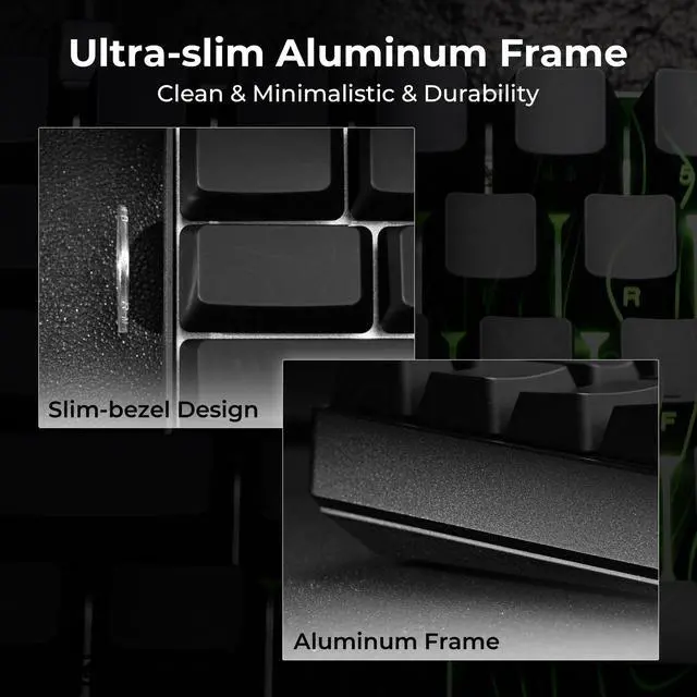 IMD Keycaps & Ultra-slim Aluminum FrameHE68 Max custom keyboard features high-quality IMD stealth keycaps paired with ultra-slim aluminum frame, blending functionality and aesthetics. Its clean, minimalistic design enhances your workspace while ensuring long-lasting, high-quality performance.