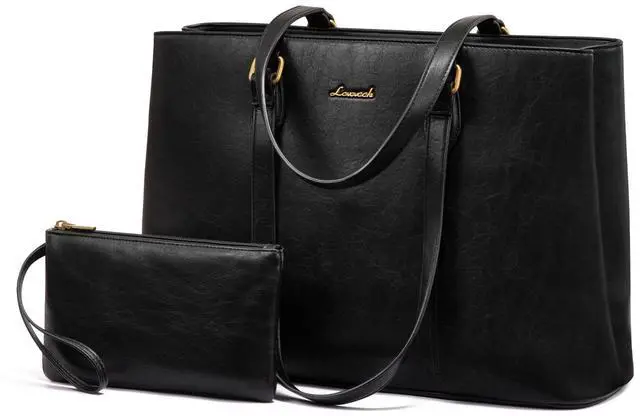LOVEVOOK Laptop Bag for Women, 15.6 Inch Waterproof Vintage PU Leather Tote Bag with Wristlet, Professional Computer Briefcase for Teacher, Work, Daily (Black)