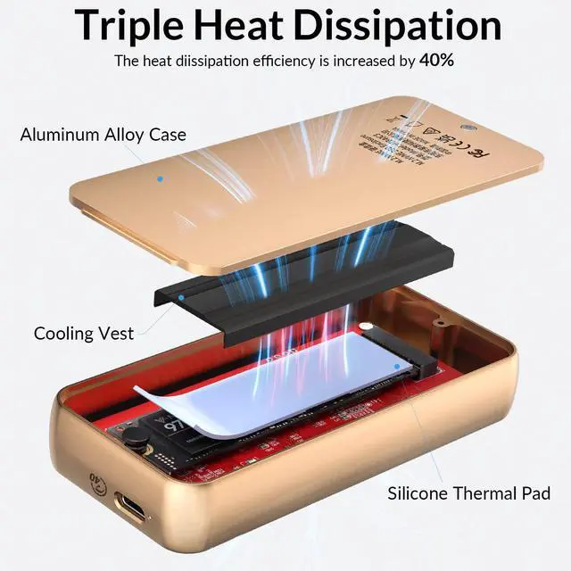 Triple Heat Dissipation, Extend SSD Life The triple heat dissipation design of the NVME enclosure increases the cooling efficiency by 40%, which protects the M.2 SSD from interrupting transmission or slowing down due to high temperature, which is beneficial to prolong the life of the M.2 SSD.