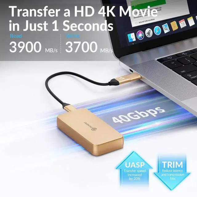 High-speed transmissionThe thunderbolt enclosure supports 40Gbps high-speed transmission, Up to 3900Mb/s. Support large file transfer. Support USB4.0 transmission protocol, compatible with Thunderbolt 4/ Thunderbolt 3/ USB 3.2/3.1/3.0.