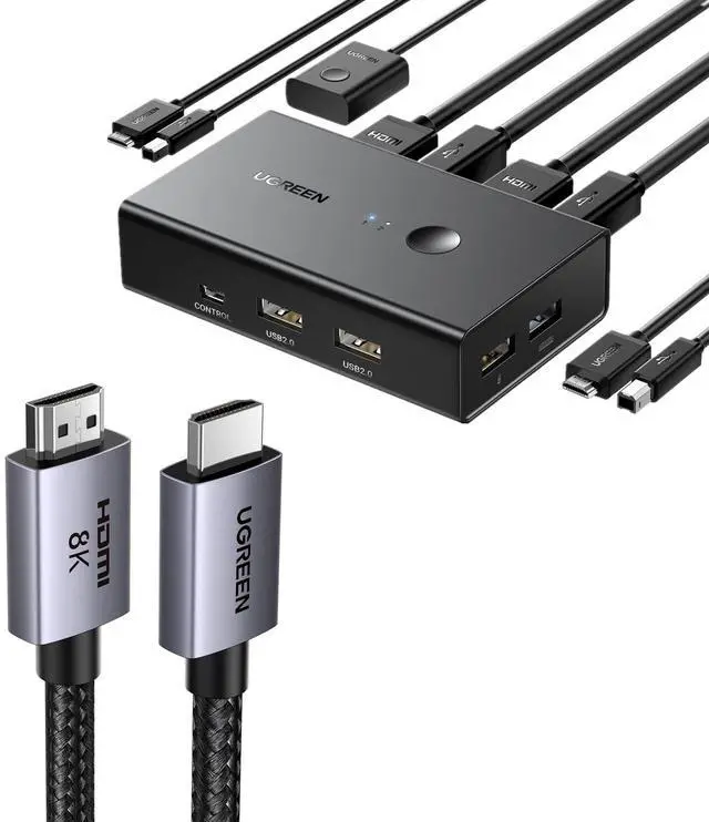 UGREEN KVM Switch 1 Monitor 2 Computers, Share 4 USB Ports, HDMI KVM Switch for Keyboard Mouse Printer Bundle with 8K HDMI 2.1 Cable 48Gbps 6.6FT, Certified Ultra High Speed Cord Aluminum