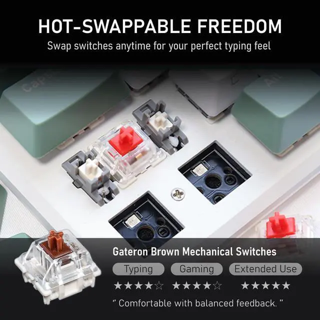 • HOT SWAPPABLE SWITCHES Much more convenient for DIY users, eliminating the need for a soldering iron or other tools to replace the switches you prefer. It saves time and effort. Delivering up to a 50 million click lifespan, N-key rollover, and anti-ghosting powered by an advanced microcontroller.