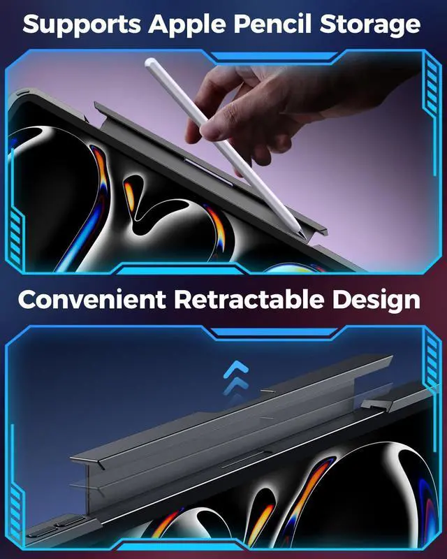 7-Color RGB Backlit Keyboard: Your iPad pro 11-inch 2024 m4/m5 2025 workflow with 7 colors and 3 brightness levels for effortless typing in any light. Enjoy quiet, responsive scissor-switch keys and convenient iPadOS shortcuts for enhanced productivity. The flexible magnetic pencil holder keeps your Apple Pencil secure