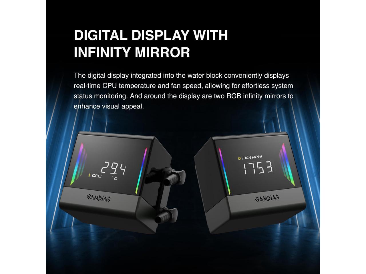 - Digital Display with Infinity Mirror: Digital screen shows CPU temp & fan speed in real time, while dual RGB infinity mirrors add stunning visual flair for both performance monitoring and style.