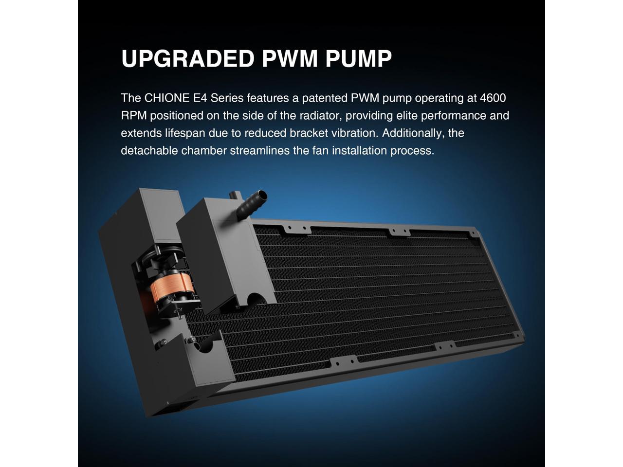 - Patented PWM Pump: Patented 4600 RPM side-mounted PWM pump boosts performance, reduces vibration for longer life, while a detachable chamber design makes fan installation fast and easy.