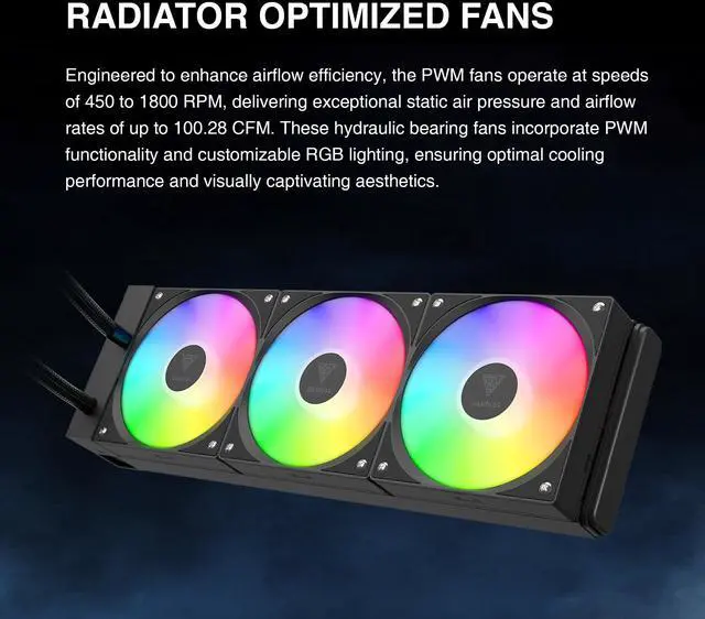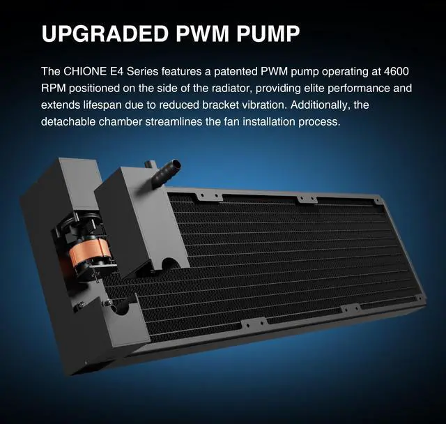 Patented PWM Pump: Patented 4600 RPM side-mounted PWM pump boosts performance, reduces vibration for longer life, while a detachable chamber design makes fan installation fast and easy.