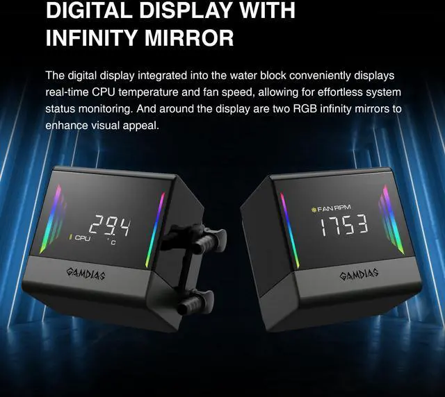 Digital Display with Infinity Mirror: Digital screen shows CPU temp & fan speed in real time, while dual RGB infinity mirrors add stunning visual flair for both performance monitoring and style.
