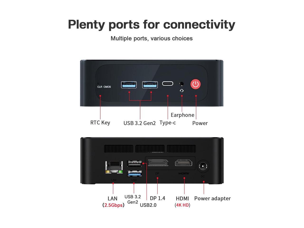 - Multiple Interfaces: The Windows Mini PC has a unique interface designed with 3 x USB 3.2 Gen2(10Gbps) port, 1 x USB 2.0 ports, 1 x Type-C(data), 1 x Type-C(USB3.2), 1 x HDMI port, 1 x DP port, 1 x DC Jack port, 1 x RJ45 2.5G port, 1 x Audio Jack (HP&MIC) port. And this mini PC wears a power LED, power button, reset b