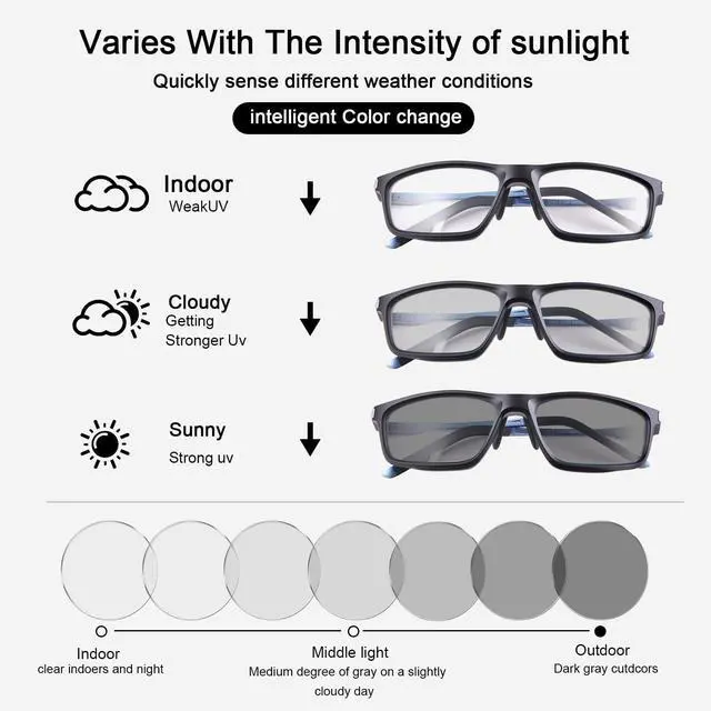 Smart photochromic material The magical photochromic material, when used outdoors, changes the transmittance of the lens with the intensity of ultraviolet rays. The transparent lens instantly turns into a light gray sunglasses lens.