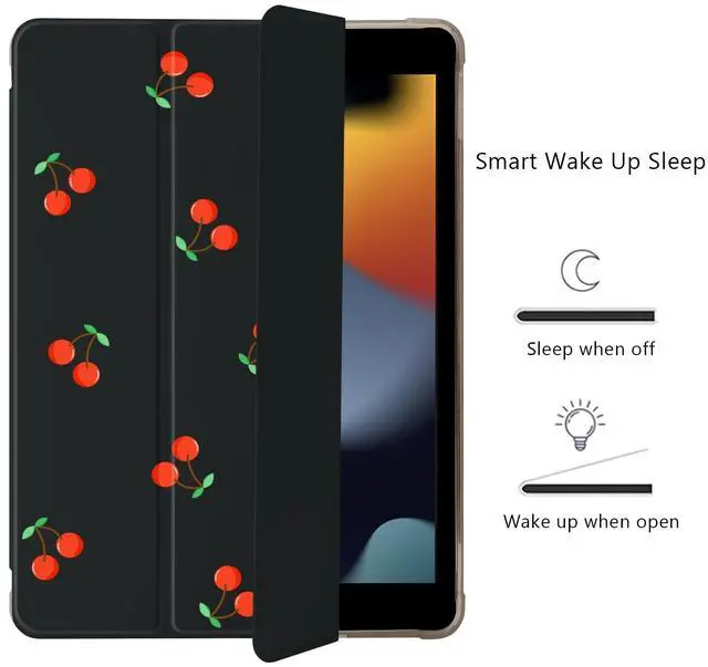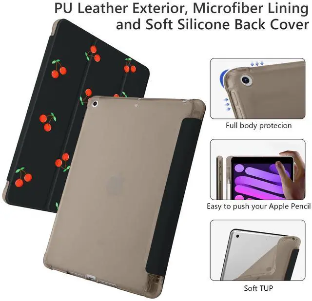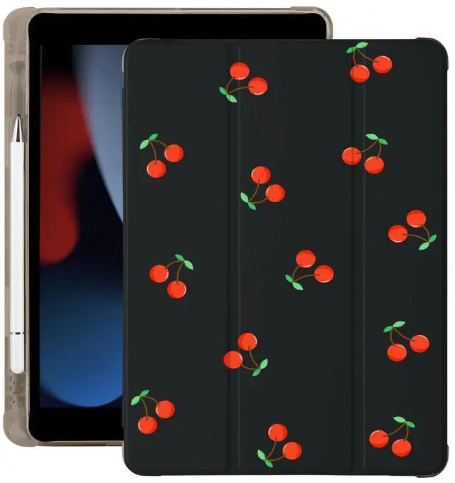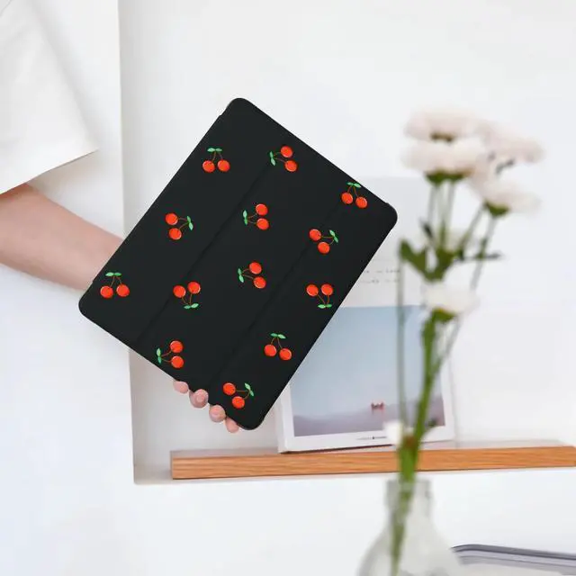 Cute Kawaii Cherry for iPad Pro 11 Inch Case M4 2024 (5th Generation) with Pencil Holder, Auto Sleep/Wake, Black Leather Soft TPU Back Cover
