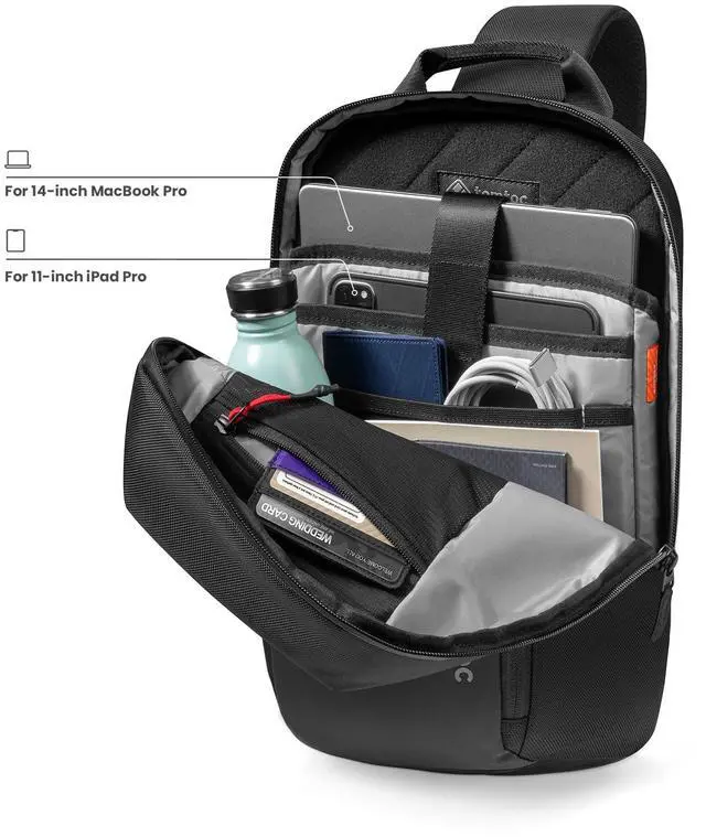 Decent Organization: This vertical sling provides multiple, versatile pockets to keep your stuff well-organized. A laptop compartment fits 14-inch MacBook Pro M5/M4/M3/M2/M1 Pro/Max 2025-2021, 13-inch MacBook Air M4/M3/M2/M1 2025-2018, 13-inch MacBook Pro M2/M1, 13-inch iPad Pro (M5/M4)/iPad Air(M3/M2); a tablet pocket for 11 inch 2025 iPad A16, iPad Air M3/M2, iPad Pro M4, M2/M1; a quick-access front pocket with a key strap and a secure back pocket allows you to get the essentials easily