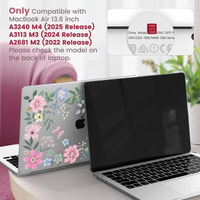 • Check Your Model: ONLY design compatible with MacBook Air 13.6 inch Case (2025-2022) M4/M3/M2 Chip (Model: A3240/A3113 / A2681). WARNING: This Macbook air case 13 inch is NOT compatible with other model laptops.Check the model number "Axxxx" on the back of the MacBook before purchasing.