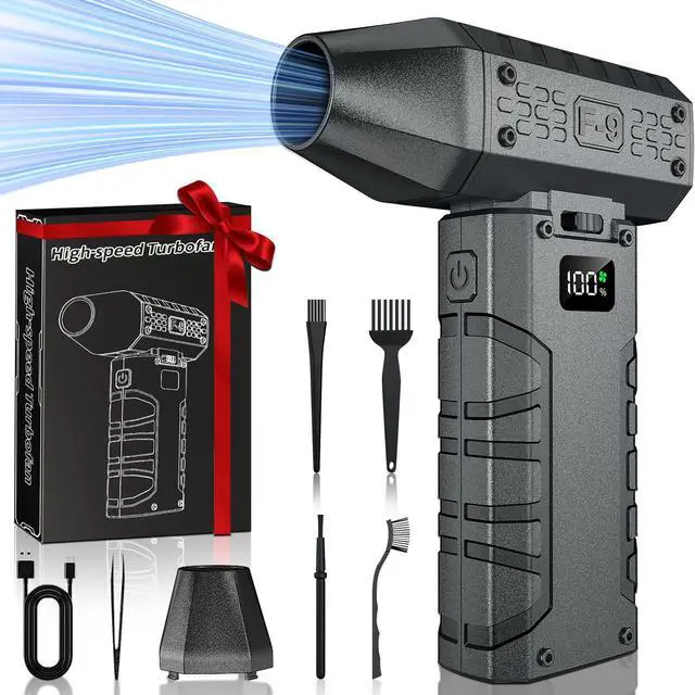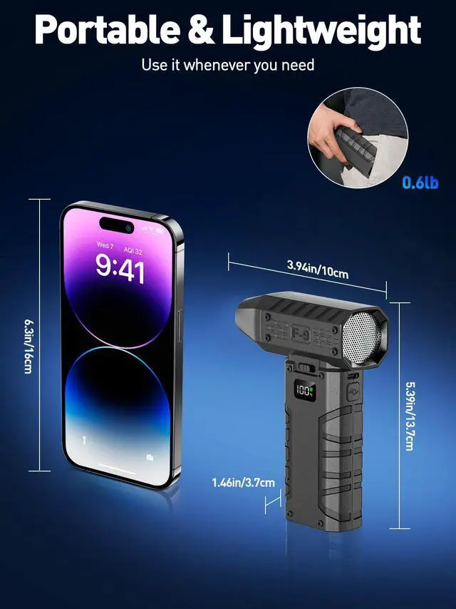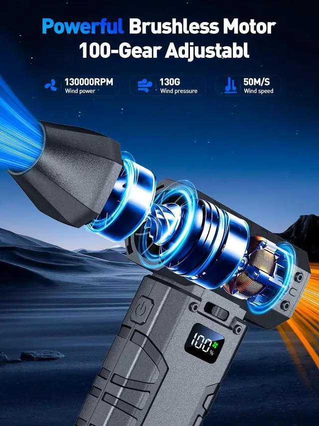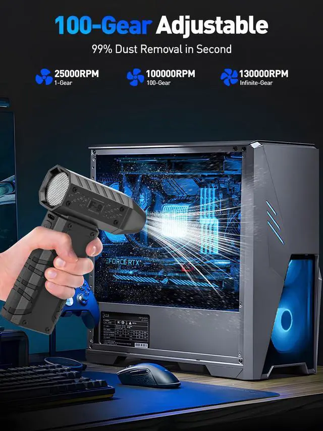 POWERFUL COMPRESSED AIR DUSTER: The electric air duster features the latest powerful motor technology, with an upgraded 130,000 RPM brushless motor that delivers a blowing force of 130G and a maximum wind speed 50+m/s. This cordless duster cleaner effectively removes dust and debris from gaps in electronic devices, offices, and car interiors, offering 100 adjustable speed settings for various cleaning tasks