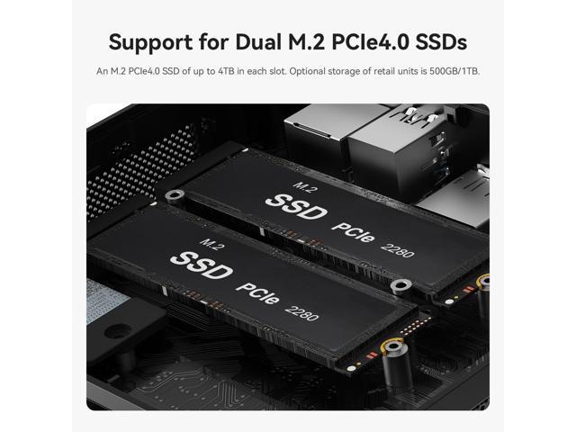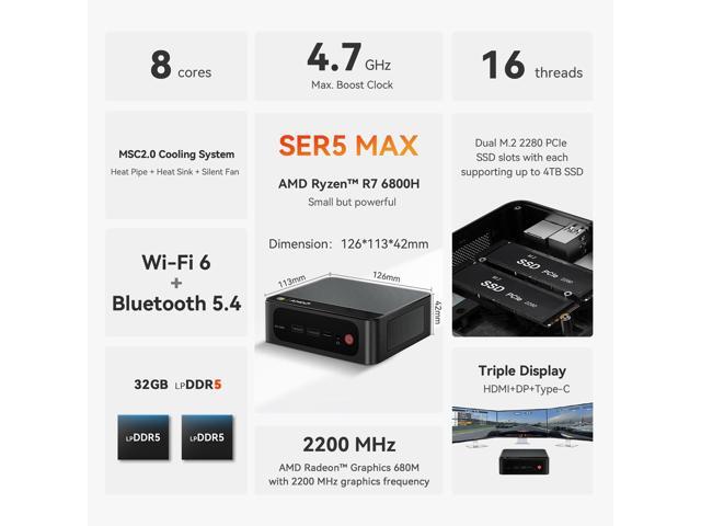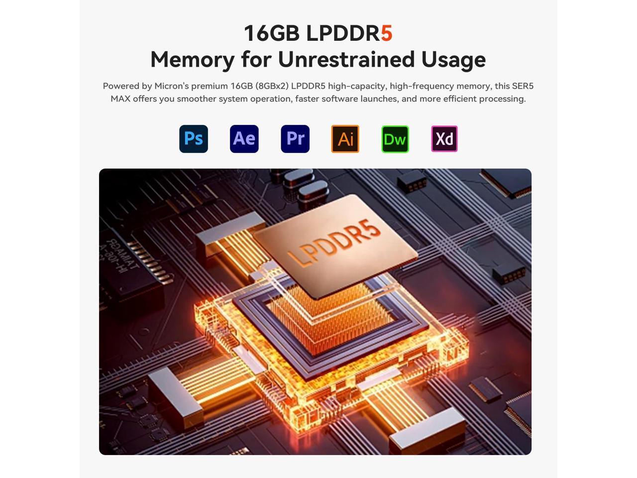 - Larger + Faster + Expandable Capacity - SER5 Max mini pc comes with 16GB LPDDR5 RAM(2 x 8GB, 6300MHz). 500GB M.2 PCIe4.0 X4 2280 SSD(upgradeable to max 8TBsingle chanel max up to 4TB), reading speed up to 5000mb/s and writing speed up to 3500mb/s. Powerful loading and processing capabiliti