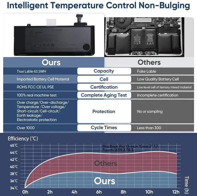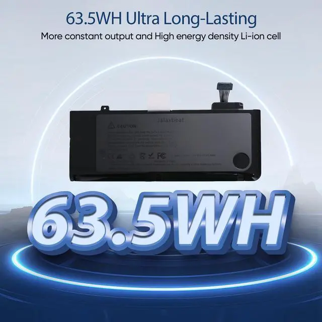 63.5Wh High-Capacity Macbook Pro Battery A1322 A1278 macbook pro battery replacement has been rigorously tested for more than 1500 hours, with a capacity of 63.5Wh, 10.95V which lasts longer than the original battery and most A1278 batteries on the market, providing reliable power for daily use.