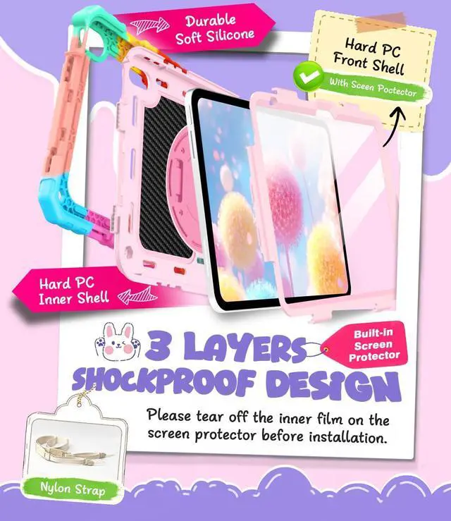 With Screen Protector: This case for iPad 11th generation kids made of durable hard PC & silicone, 3-layer full body protection structure with SCREEN PROTECTOR, provide a military grade protection & anti-scratch.