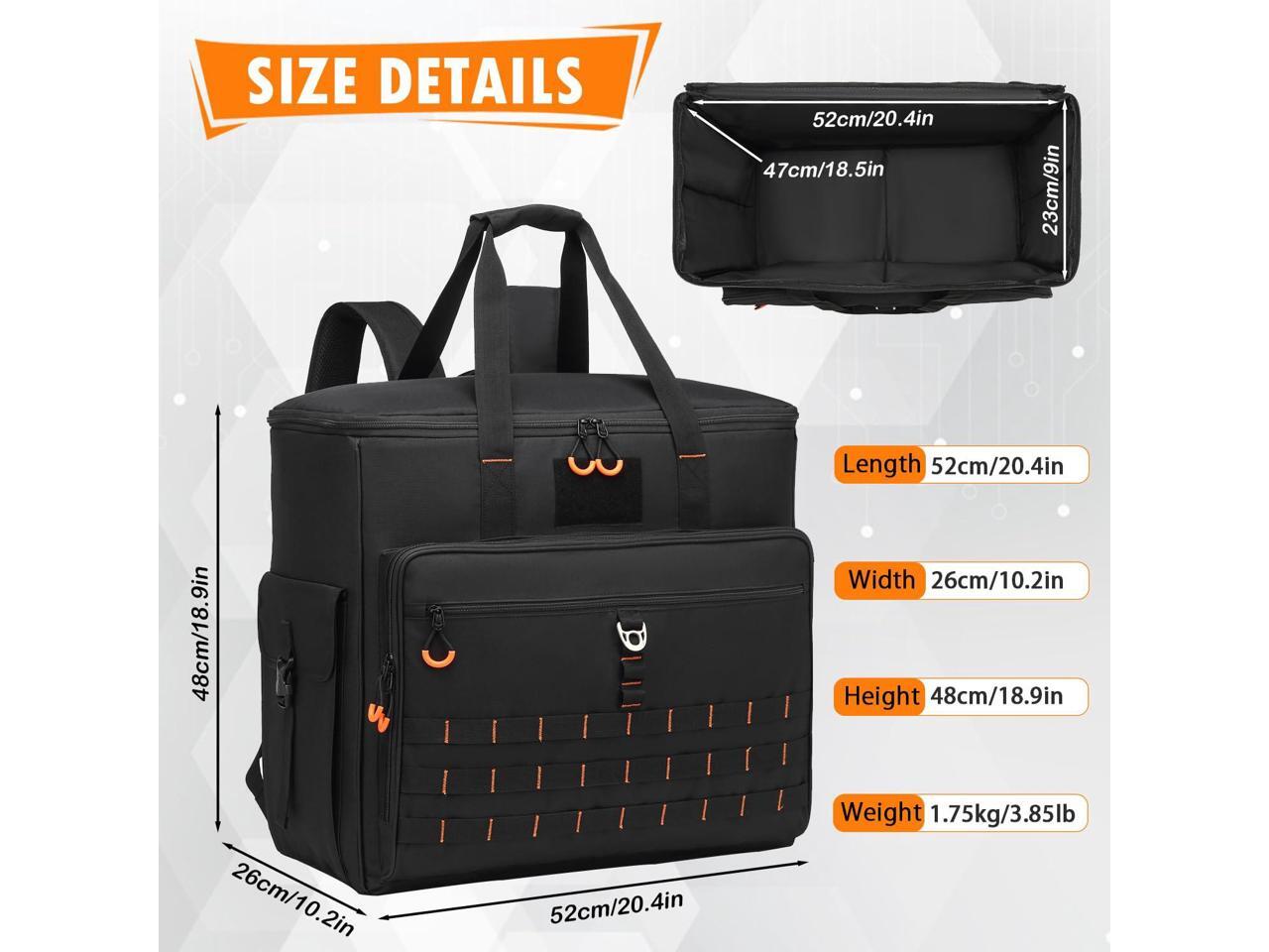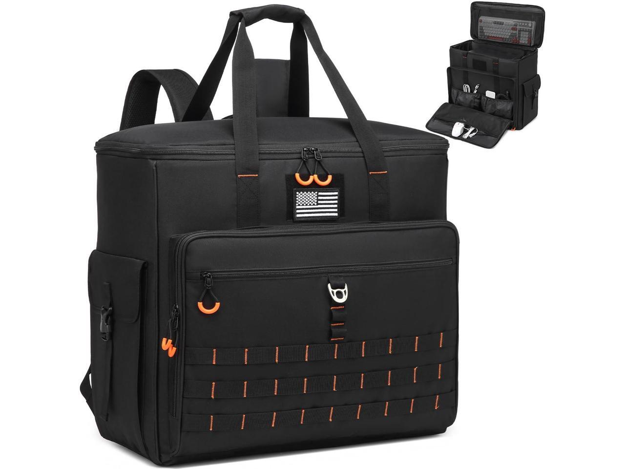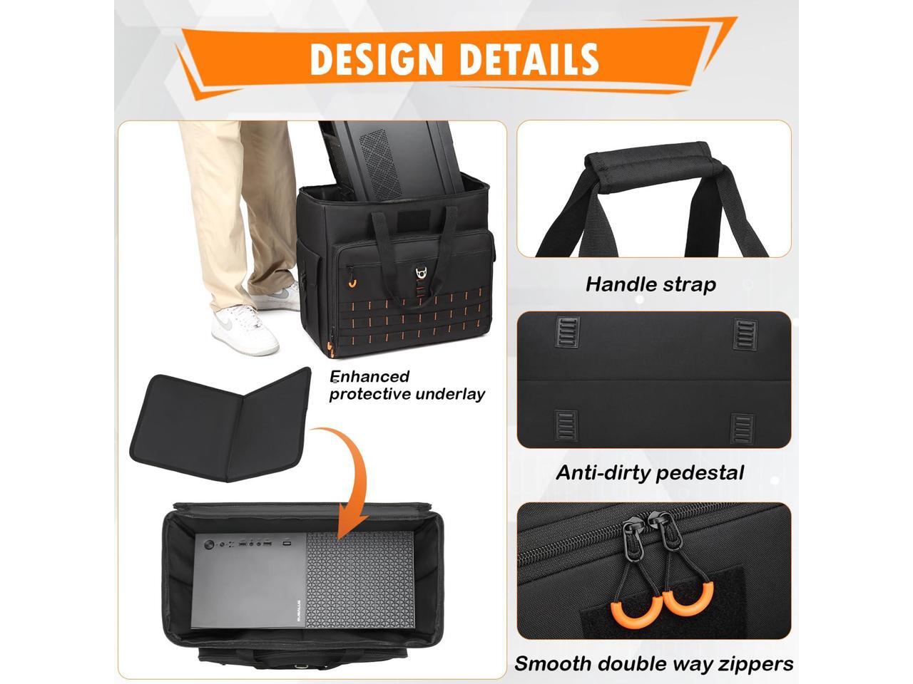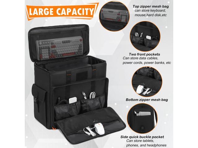 - Multiple Organized Pockets & Secure Storage: Keep all your accessories neatly organized and within easy reach. This desktop carrying case features multiple dedicated pockets to safely store your keyboard, mouse, cables, headset, hard drives, and cooling systems. The reinforced side pockets with secure buckles prevent your valuable items from falling out during transit, ensuring nothing gets lost or left behind