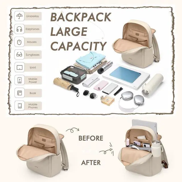 Upgrade DesignThis upgraded travel backpack not only features multiple compartments and pockets, but also has a hidden anti-theft zipper pocket inside. Compared with other daily backpacks, this upgraded version has more practicality. Let it be your daily backpack! It can hold daily necessities such as laptops, ipads, headphones, books, clothes, water cups and umbrellas, and all of them can be neatly organized.