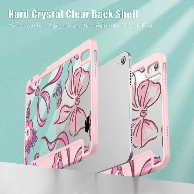 Mektron Case for 2025 iPad 11 inch (A16 Chip) 11th Gen Fit iPad 10th Gen 10.9 inch 2022, Buit in Pencil Holder with Shockproof Cover Clear Shell + Trifold Stand, Flowers-Bows-Pink
