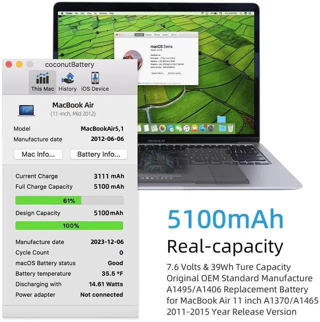 OEM Standards Manufacture: Real capacity 7.6Volts=39Wh 5100mAh. Same manufacturing standards as the original A1495 / A1406 battery for MacBook Air 11" Model A1465 / A1370. Provide up to 1000+ recharge cycles and support fast charging with overcharge and discharge circuit protection