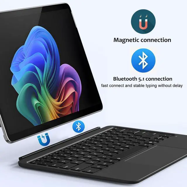 A bluetooth keyboard cover design for Surface Pro 12 " 1st 12 inches laptop released in 2025, with skin-like panel and 7 colors of background lights. Magnetic docking with tablet. the back side made of comfortable and durable microfiber.