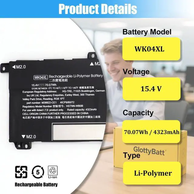 BATTERY SPECIFICATION: Model Name: WK04XL; Voltage: 15.4V; Capacity: 70.07Wh 4323mAh; Battery Type: Li-ion; Condition: 100% brand new from manufacturer; Package include: 1*battery + battery installation screwdrivers + 1*instruction for laptop battery