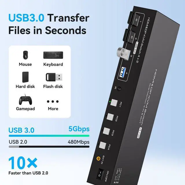 With 4 USB 3.0 PortsThe dual monitor kvm switch is equipped with 4 standard US