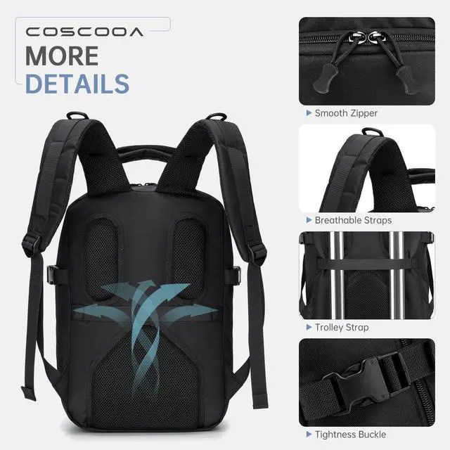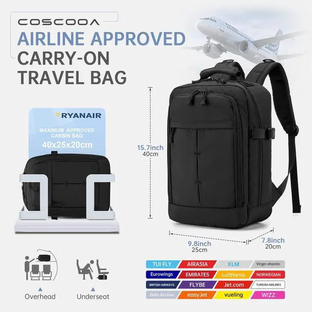 Airline Approved Personal Item Travel BackpackThe size of the COSCOOA Travel backpack corresponds exactly to the maximum size that can be taken in the cabin on flights with Ryanair 40x20x25cm/20L. It is approved by most airlines including Ryanair, United Airlines and Frontier Airlines. (Dimensions: 40 x 25 x 20 cm/15.7 x 9.8 x 7.9 inches; Weight: 0.77lbs.),fit for United Airlines Personal Item Bag 17x10x9 inch.