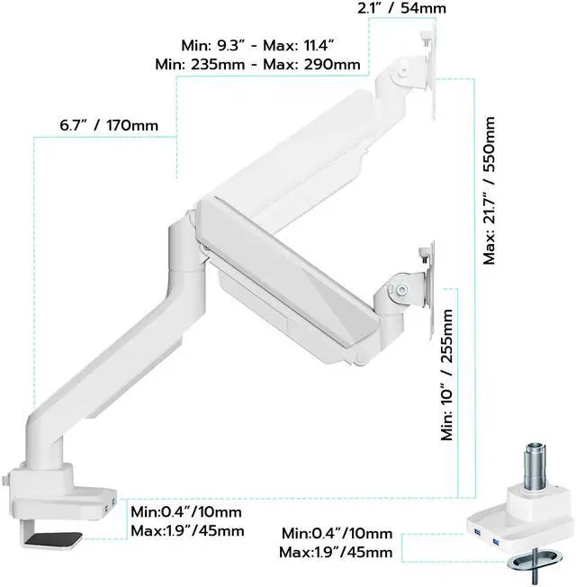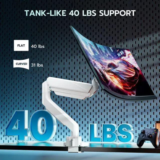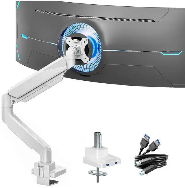 ARES WING Single Monitor Arm, Heavy Duty Adjustable Monitor Arm for 13"-49" Screens with USB, Gas Spring Desk Mount Stand with C Clamp/Grommet Mounting Base up to 40lbs Computer, White