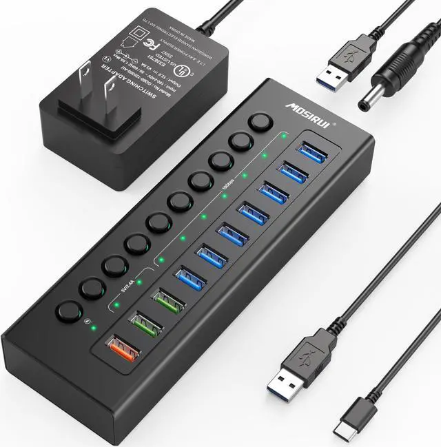 Powerful 36W Power Adapter: This USB hub powered comes with a 36W (12V/4A) power adapter that ensures stable data transfer and plenty of power for all connected devices. The 10-port usb powered hub protects your devic