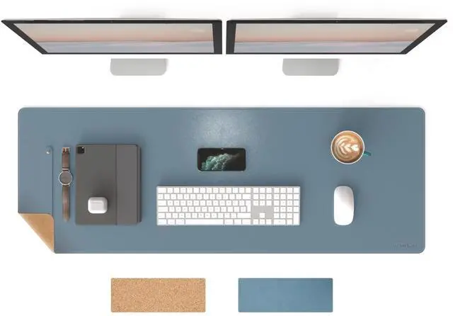 RENMTURE Dual-Sided Mouse Pad, Natural Cork & PU Leather Large Desk Pad for Office and Home Work, Desk Protector Non-Slip, Waterproof, Easy Clean (Blue Gray, 47"x17")
