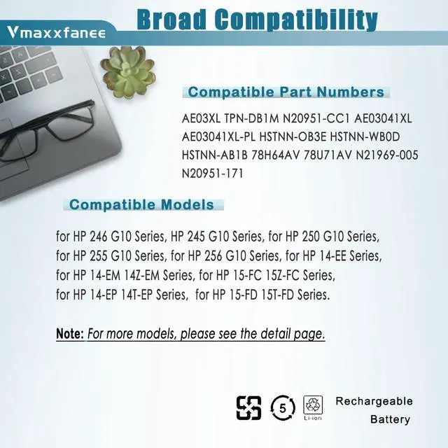 AE03XL Laptop battery Compatible laptop Models AE03XL battery for for HP 246 G10 Series, HP 245 G10 Series, for HP 250 G10 Series, for HP 255 G10 Series, for HP 256 G10 Series, for HP 14-EE Series, for HP 14-EM 14Z-EM Series, for HP 15-FC 15Z-FC Series, for HP 14-EP 14T-EP Series, for HP 15-FD 15T-FD Series.