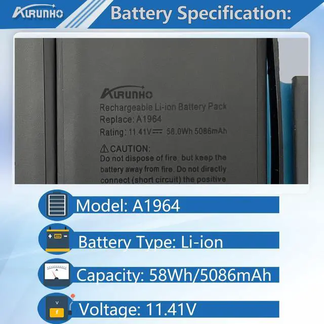 Specifications Model: A1964 . Voltage: 11.41V . Capacity: 58Wh/5086mAh. Color: Black . 100% brand New from Manufacturer.
