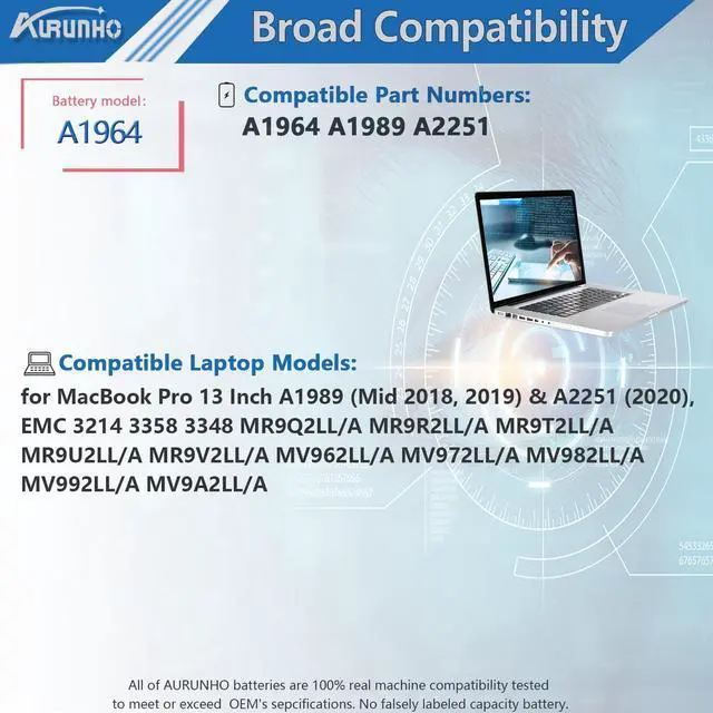AURUNHO A1964 Laptop Battery Replacement for MacBook Pro 13 Inch A1989 (Mid 2018, 2019) & A2251 (2020), EMC 3214 3358 3348 MR9Q2LL/A MR9R2LL/A MR9T2LL/A MR9U2LL/A MR9V2LL/A MV962LL/A MV972LL/A