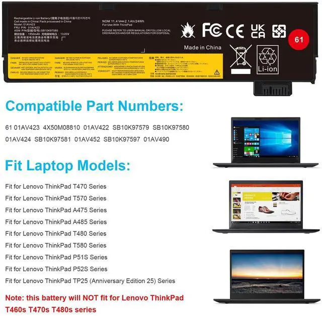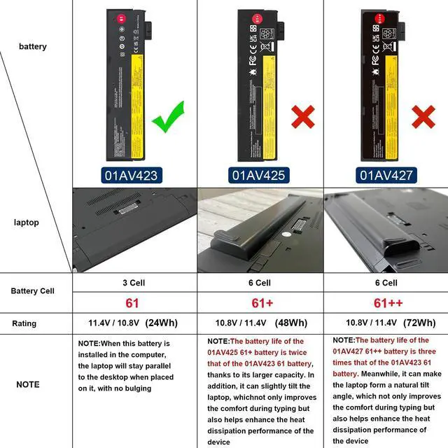 Specifications:Model:01AV423; Voltage:11.1V;Capacity:24Wh Cell:3Cells;100% brand new from manufacture. Grade A cells ensure fast charges and low power consumption.