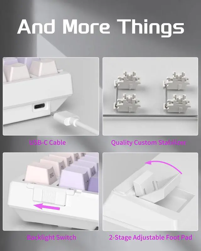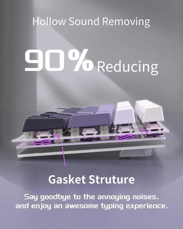 GASKET-MOUNTED STRUCTURE: Unlike the traditional screw fixed structure, the positioning plate of the SKY98 creamy keyboard is fixed in the middle by the pressure of the upper and lower shells. There are gaskets distributed around the positioning plate to prevent direct contact between the interior and the shells, acting as a cushioning layer and effectively reducing vibration and noise generated when typing. This keyboard feels soft and even, elastic and has pure sound.