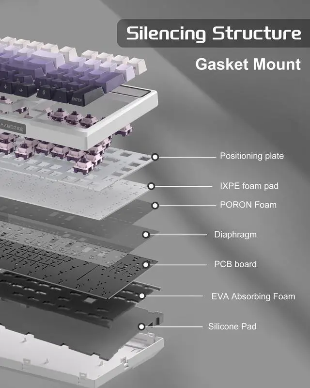 5-LAYER SOUND ABSORBING FILLING: In order to improve the noise situation, this gasket keyboard is equipped with a IXPE foam pad, PORON foam, diaphragm, EVA soundproofing foam and silicone absorbing pad in the gaps between the positioning plate, PCB board and bottom. This reduces the resonance space inside the keyboard, thereby suppressing hollow sounds and making every key press comfortable and pleasant. For gamers and office users, this keyboard is a great addition to the desktop.