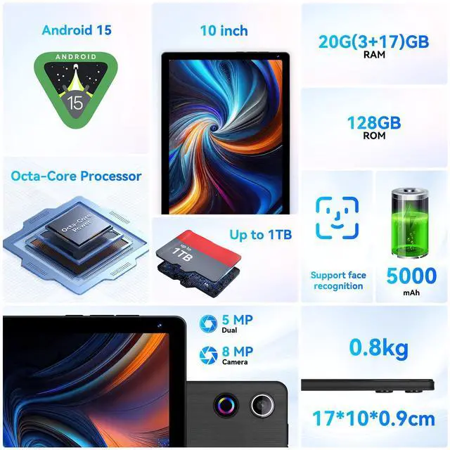 Android 15&High PerformanceGet ready to zip through everything on the latest Android 15 tablet. An advanced 8-core processor and massive 20GB RAM (plus smart tech for extra smoothness) deliver desktop-like speed. Game hard, stream your favorite shows in HD, or run multiple demanding apps at once no frustrating lag, just smooth sailing.