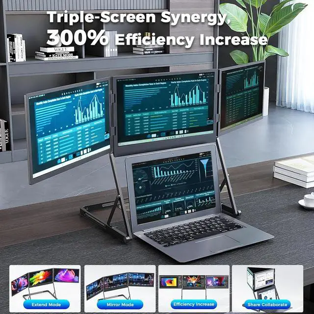 ^^ One-Cable Plug & Play Setup Easy and EfficientSimplify your setup with just one USB-C or USB-A cable that powers and connects all three or four screens simultaneously. Compatible with Windows, macOS, and most laptops from 13.6" 17.3", this laptop screen extender 3 monitors offers seamless plug-and-play convenience without driver headaches. (Full-featured USB-C or Thunderbolt port required for best performance. ) ^^ Foldable & Portable Design for Travel and Remote WorkTake your workstation anywhere with this foldable triple monitor for laptop. Lightweight, compact, and protected by a durable folding frame, this portable multiple monitor setup easily fits into your backpack perfect for digital nomads, students, and professionals who work on the go.