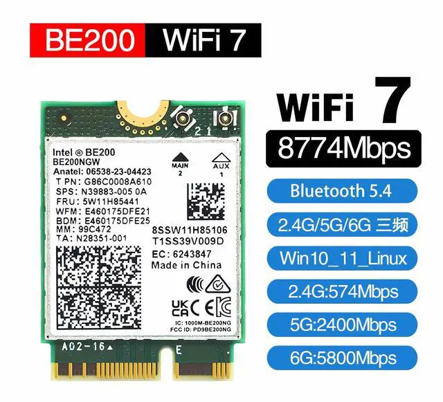 Wi-Fi technologySupports Wi-Fi 7 technology and provides Tri-band support. 2.4GH z (574Mbps) for the long range, 5GHz (2400Mbps) for the high speed, 6GHz (5800Mbps) for the higher speed, Interference free and Ultra-low Latency. ^^ Updated Bluetooth 5.4B ased on Bluetooth 5.3, it has larger capacity, higher speed, extremely low latency and stronger battery life. ^^ WPA4 Network SecuritySupports the latest WPA4 WiFi security protocol and is backward compatible with WPA3. ^^ Installation requirementsSuitable for motherboards with Intel CPUs and M2 network slots, size NGFF M2 2230 E key.