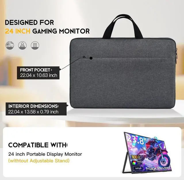 Front Pocket: 22.04 x 10.63 inch. Compact size with handle design make it easy to carry. Suitable for most 24 inch portable monitor without adjustable kickstand. ^^ COMPATIBLE- This 24 inch large portable monitor case compatible with InnoView 23.8" monitor, U-PERFECT 24 monitor, 23.8" HotYeah FLYTOCCA Kenowa Prechen monitors, ASUS ZenScreen 24, ViewSonic TD2465/TD2423D 24 Inch large portable display monitor. (NOT FIT for 24 inch laptop & 23.8 -24 inch monitor with adjustable kickstand) ^^ Quality Material-This 24 inch monitor carry case made of high quality water-resistant oxford, soft-touch suede interior and middle cushioning pad to protect the full body of your laptop from dust, dirt, scratch, bump, rainwater and splashing liquid. ^^ Enough Storage Space- Except the MAIN COMPARTMENT for your monitor, this carrying sleeve case bag also has ONE LARGE COMPARTMENT ON FRONT to keep small iPad, mouse, charger devices, power cord, cables, earphone, pens, hard drives, power bank etc.... ^^ Portable & Lightweight- This 24 inch monitor sleeve is SLIM AND LIGHTWEIGHT, constructed with comfortable hand strap, convenient for travel! Perfect choice when going on holiday, business trip, travel, office.