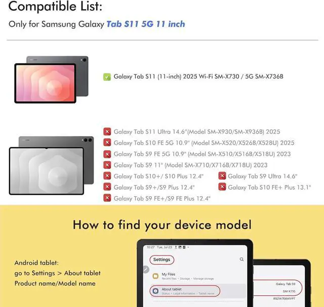 CompatibilityCompatible with Samsung Galaxy Tab S11 2025 11 Inch SM-X736B/ SM-X730 tablet PC. NOT suitable for other Samsung Galaxy Tablet models. ^^ High qualityCase fully covers your Samsung Tablet s9 fe and provides comprehensive protection against scratches, drops and bumps. The soft TPU back protects your device from accidental knocks or bumps. ^^ Multi-angleThis case for galaxy tab s9 fe with integrated wrist strap and latch allows you to hold your device securely with one hand while on the go. The multi-angle stand function offers convenient viewing angles for comfortable media consumption or typing.