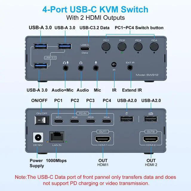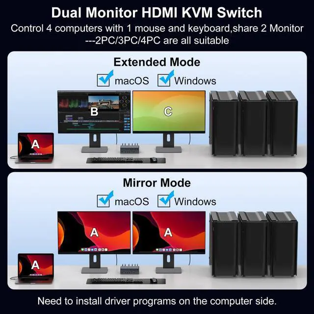 Kvm Switch 2 Monitors 4 ComputersThis Usb docking station supports seamlessly connect 4 computers (USB 3.0 /Thunderbolt) to 2 HDMI displays, supporting mirror or extended mode. Share 1 keyboard/mouse, 3 USB 3.0 ports, 1 USB-C 3.2 port, Gigabit Ethernet, and 3.5 mm audio jack to enhance workflow efficiency and save desk space.