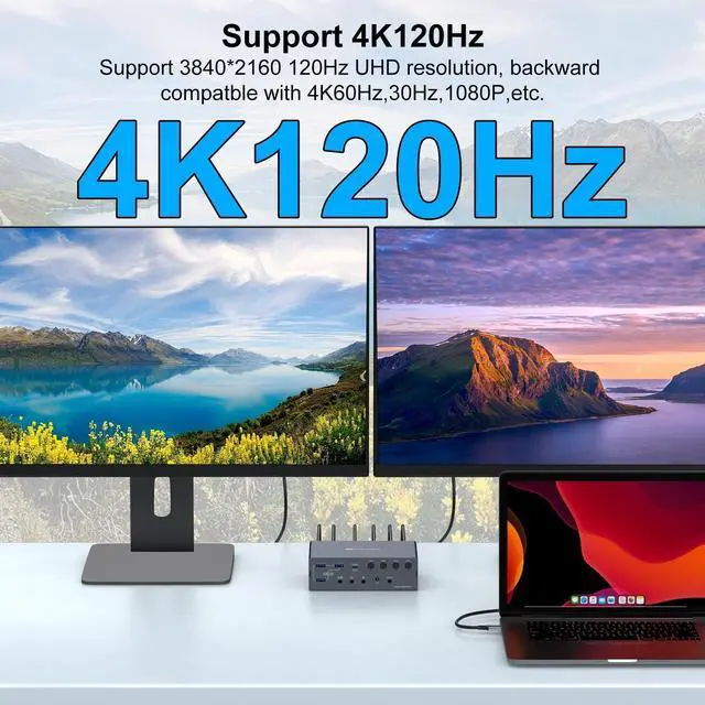 Recommended: CPU Intel i7 or above, and 16GB RAM to ensure optimal performance. ^^ Dual 4K@120Hz DisplayThis KVM switch docking station supports dual-monitor setups with two dedicated HDMI outputs, each capable of 4K@120Hz simultaneous display. It eliminates the need for DisplayPort, offering a streamlined plug&play solution for seamless device switching while maintaining ultra-smooth, high-resolution visuals on both screens